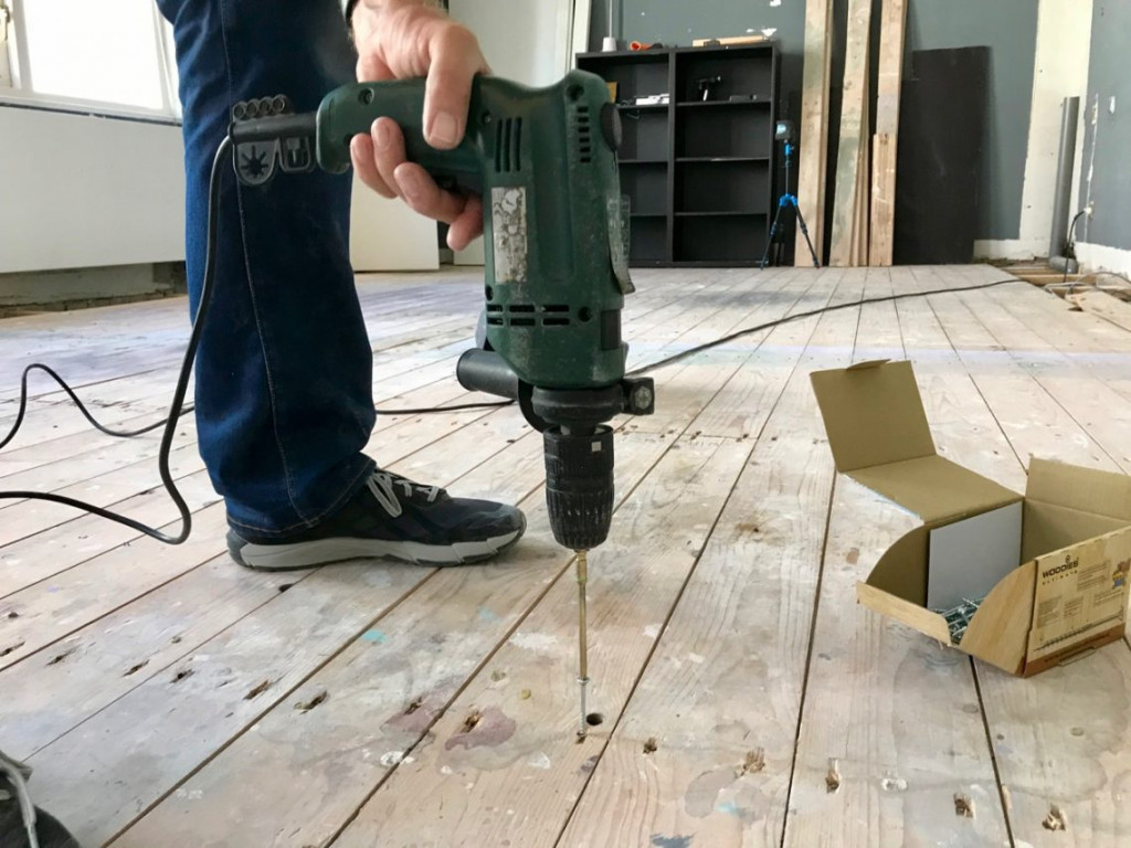 Het was een eenvoudig en meditatief werkje. Ik had drie dozen gekocht, 600 stuks. Voorovergebogen als de gebochelde van de Notre Dame schuifelde ik balk voor balk en plank voor plank door de kamer. Elke plank kreeg twee schroeven, meestal in het oude spijkergat. Tegen vijven waren de Woodies op. Ruim driekwart van de kamer is nu geschroefd.