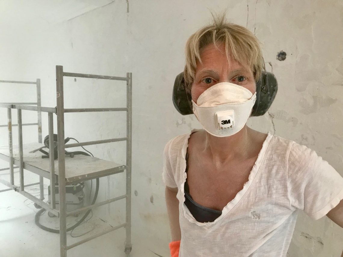 Gisteren heeft ze zonder morren de eerste helft van de muur kaalgeschuurd. De halve muur! Daar zou ik zelf een dag of drie voor uitgetrokken hebben. Ik was er op voorbereid dat ze vandaag stijf van de spierpijn op bed zou blijven liggen, maar niks daarvan. Om elf uur vanochtend stond ze alweer op de steiger. Met de slijptol.