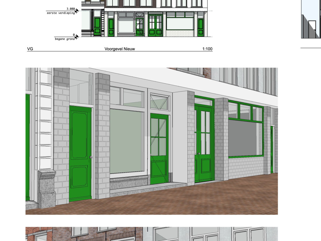 Toen Hessel begreep wat men wilde, was het geen moeite dat te tekenen. Het pand mag dus op geen enkele manier visueel aansluiten bij ons pand. Dus geen ‘badkamertegel’, geen borstwering (dat is het stuk onder de vensterbank van steen), geen paneeldeur maar een beetje de glazen bioscoopdeuren van vroeger. Prima. Hessel mocht het plan opnieuw indienen met zijn eigen schetstekening.