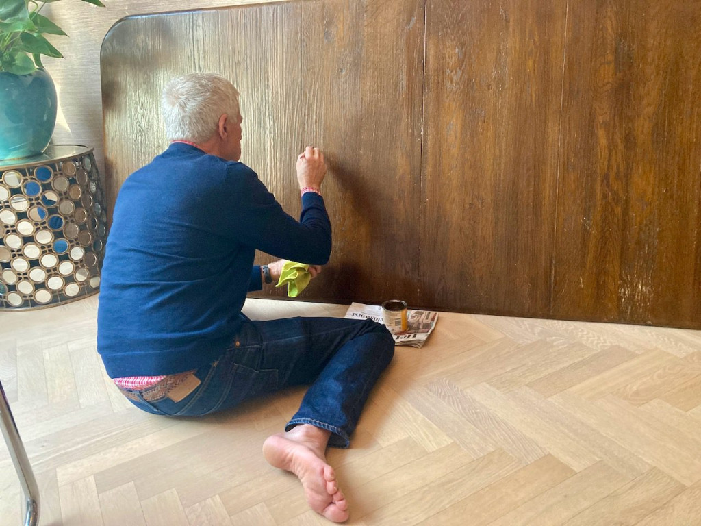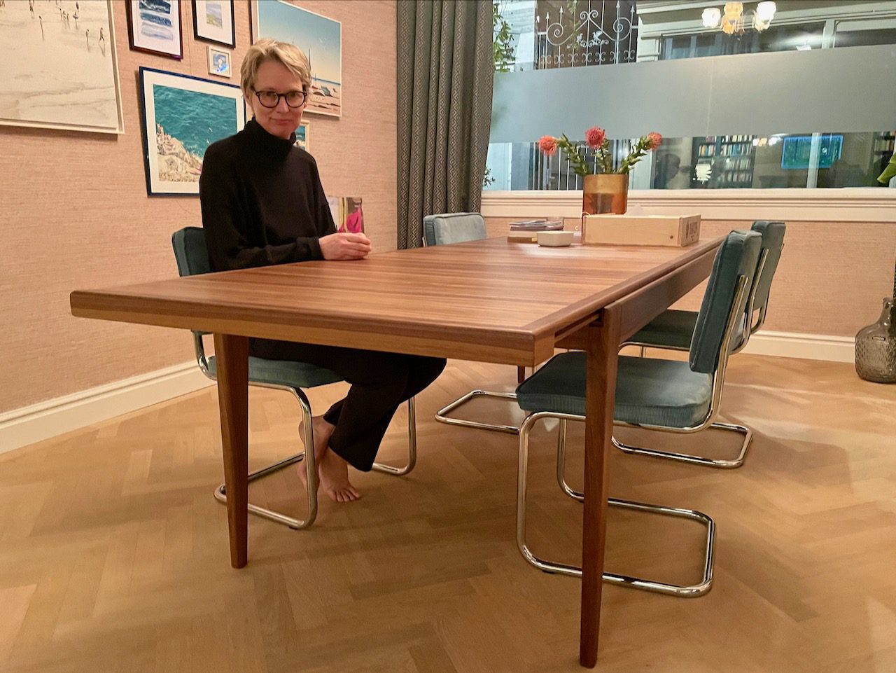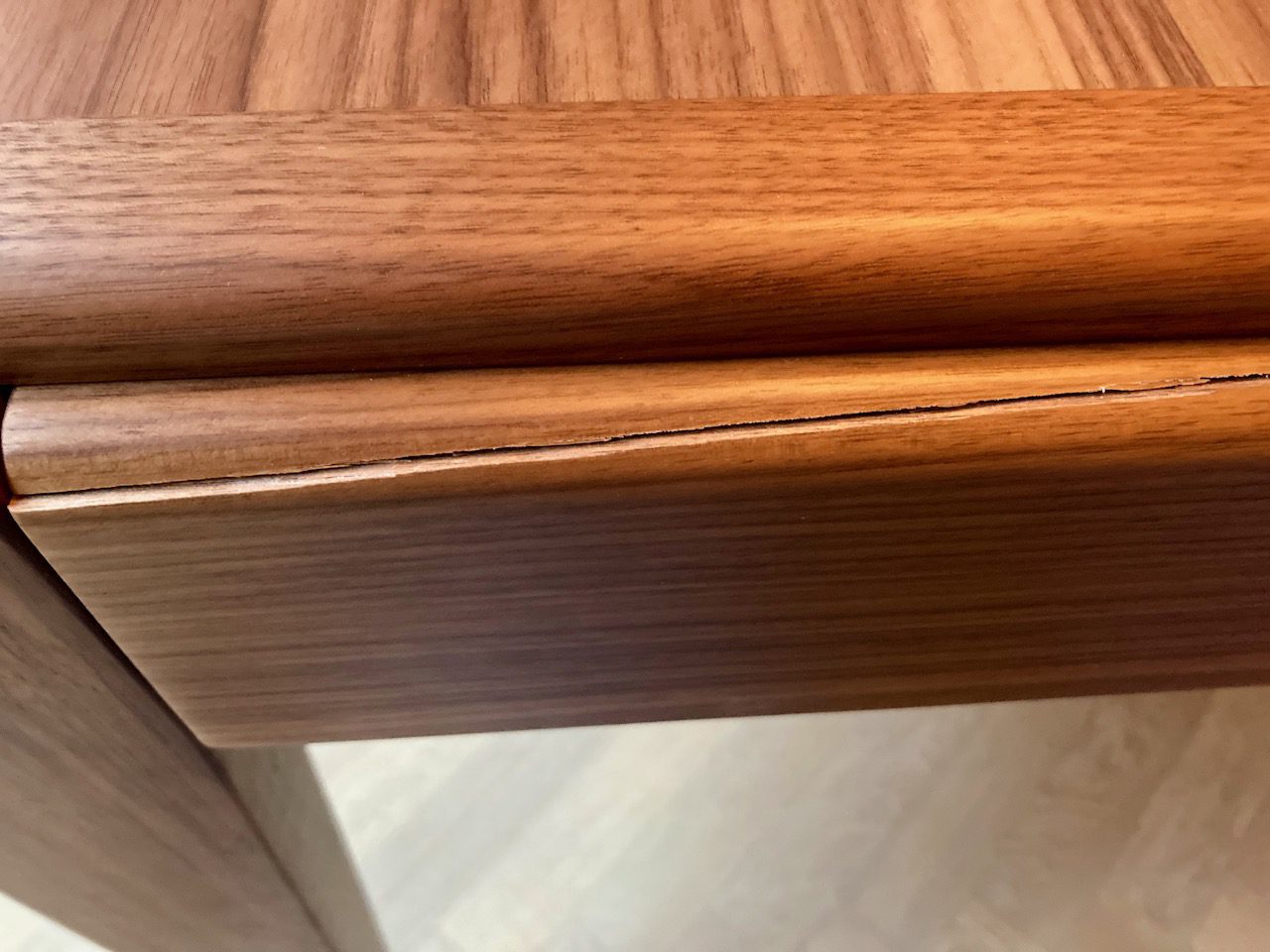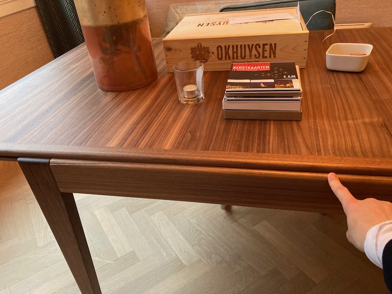 Superleuk allemaal, maar ik was in tweestrijd: zou ik Hessel nu wel of niet wakker maken? Toch maar wel gedaan. De tafel is prachtig. Maar toen we ‘m nog even op z’n plek schoven zagen we een gigantische knak in het framewerk. Een scheur tot halverwege de tafel..