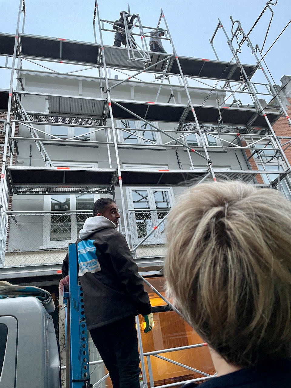 In de ochtend kwamen de steigermannen de steiger verwijderen. Volgens een heel strak systeem haalden zij in no time alles naar beneden en in hun wagen.
