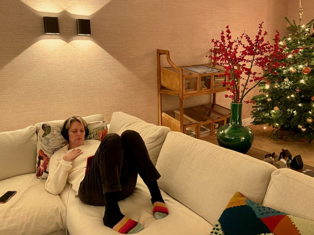 Oeps. Gelukkig komt alles goed en wordt de tafel in januari omgeruild. Helemaal superlollig is het niet, maar echt erg is het ook niet. In diezelfde categorie hadden we ook een incidentje met de nieuwe bank. Het begon ons nogal op te vallen dat mensen die langskwamen opeens erg graag in de keuken wilden koffie drinken, of aan tafel, of op een kussen gingen zitten. De bank was zo wit, we waren er allemaal een beetje bang van. Plus dat ik op een ochtend zag dat er een hele blauwe vlek zat op de plek waar Hessel altijd zit. Zijn broeken geven af op de bank. Omdat er een glansdraad in de stof zit, spiegelt het groene kleed een grauwe gloed over het geheel. Het voelt niet zo gezellig. Hugo de Jonge zou iets zeggen in de trant van “De bank past wel bij ons leven, maar ons leven past misschien niet zo bij de bank..” Wij hadden inmiddels roomwitte yogadekens over de kussens gelegd, zodat we wat relaxter op de bank konden zitten. En liggen… Waarschijnlijk is het beter als we een andere stof gaan kiezen..