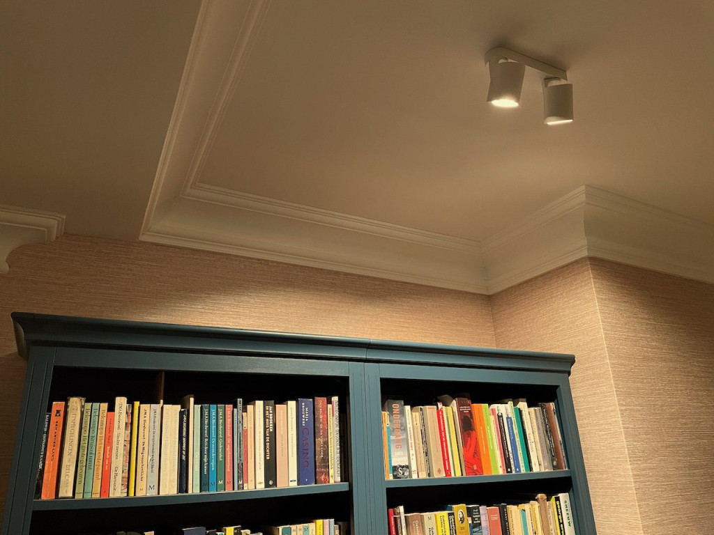 Ook kwamen er nieuwe lampjes. De oude peertjes werden vervangen en opeens hadden we spotjes bij de boekenkasten.