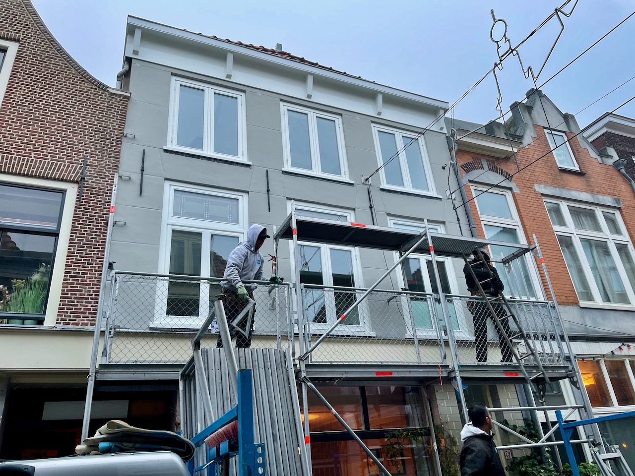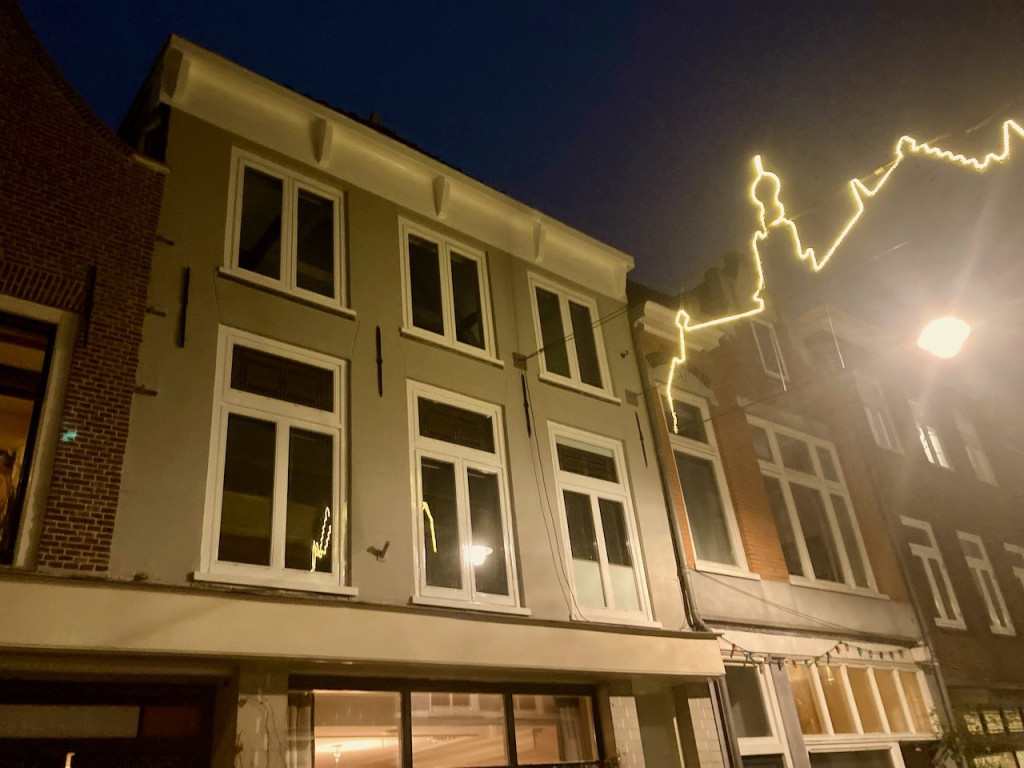 Eindelijk zagen we de gerenoveerde voorgevel van het bovenhuis. We dachten eerst dat het ‘wit’ iets te ‘wit’ was, maar na even wennen bleek dat het er gewoon superverzorgd en strak uitziet. Dat kan weer een paar jaar mee. Met de feestverlichting is het helemaal top.