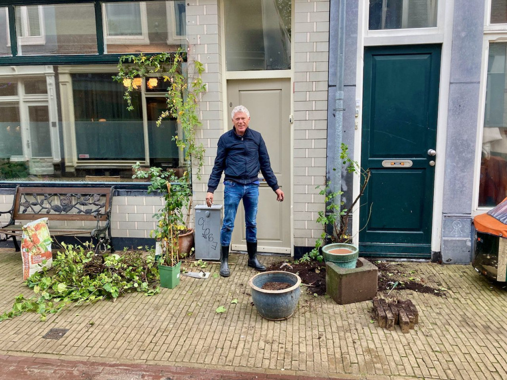 Het blijkt dat je een klimroos in de grond moet planten omdat de wortels heel diep moeten kunnen. Maar het soort ‘potding’ waar de oude voormalige roos in stond was superlelijk. Ik had dus een mooie pot gekocht en Hessel had daar de bodem uitgeboord. (Het vermoeden van) de oude roos konden we laten staan, en daar schoven we de nieuwe pot overheen. Ook hadden we een nieuwe roos gekocht die samen met de oude in de pot mocht. De pot bleek niet te passen, dus we moesten nog een andere pot uit de achtertuin halen, maar uiteindelijk stond het beeldig..