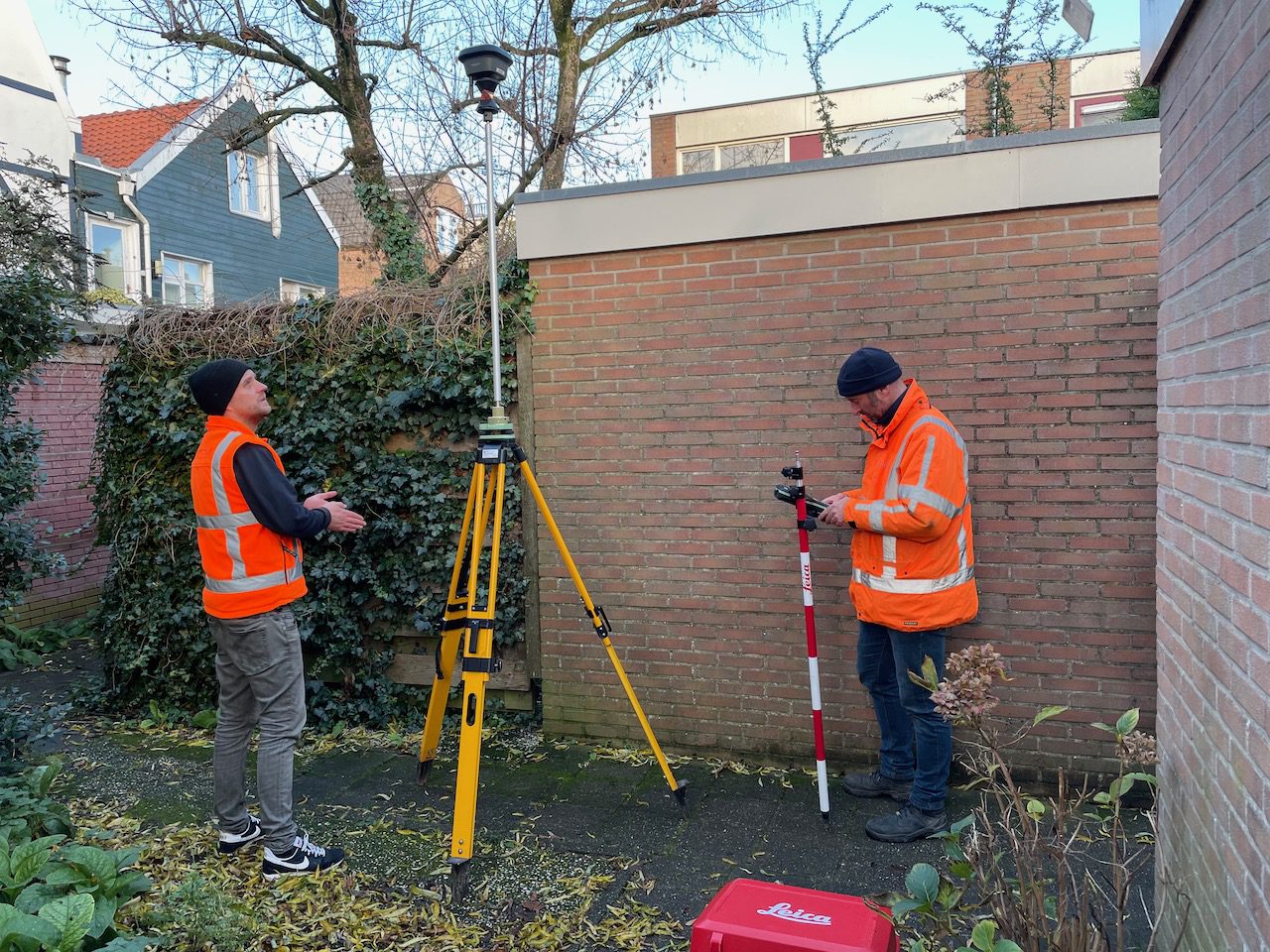 In diezelfde week kwamen ook de mannen van het kadaster. Zij moesten de nieuwe grenzen inmeten voor het theater, het stuk wat een tuin gaat worden. Ook waren ze er op verzoek van Ymere, dat ons een stukje grond gaat verkopen. Alles wordt op de juiste manier ingetekend en overgedragen. Ze gingen grondig te werk. Het oude theater werd nagemeten, de nieuwe grenzen van de tuin van de buren met paaltjes afgezet, ze stonden op het dak, ze deden GPS metingen in het steegje, en nu hebben we het best gedocumenteerde stukje grond van Haarlem.