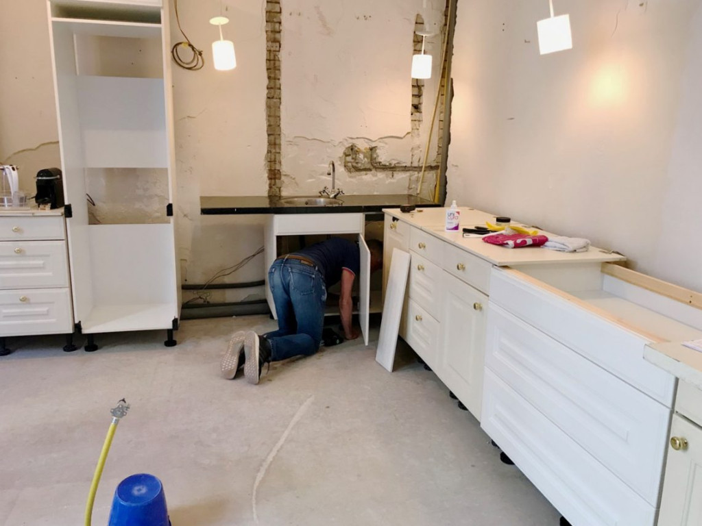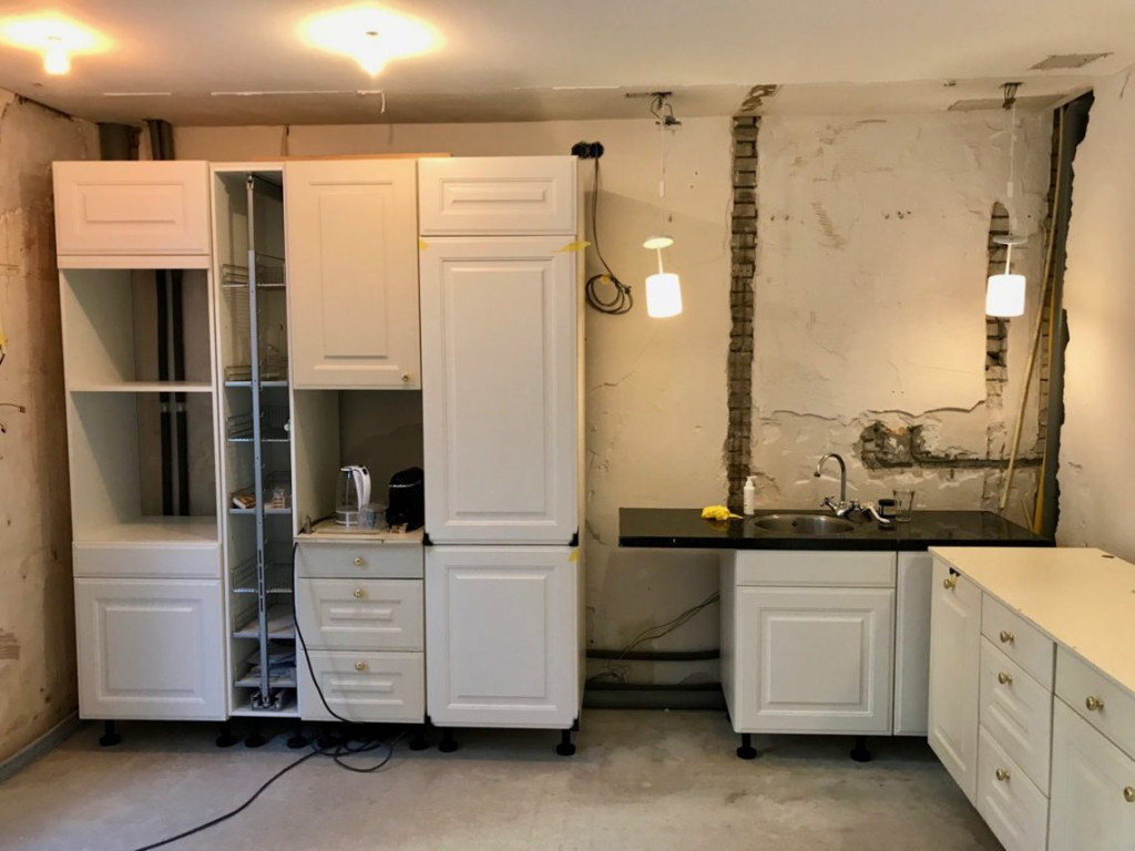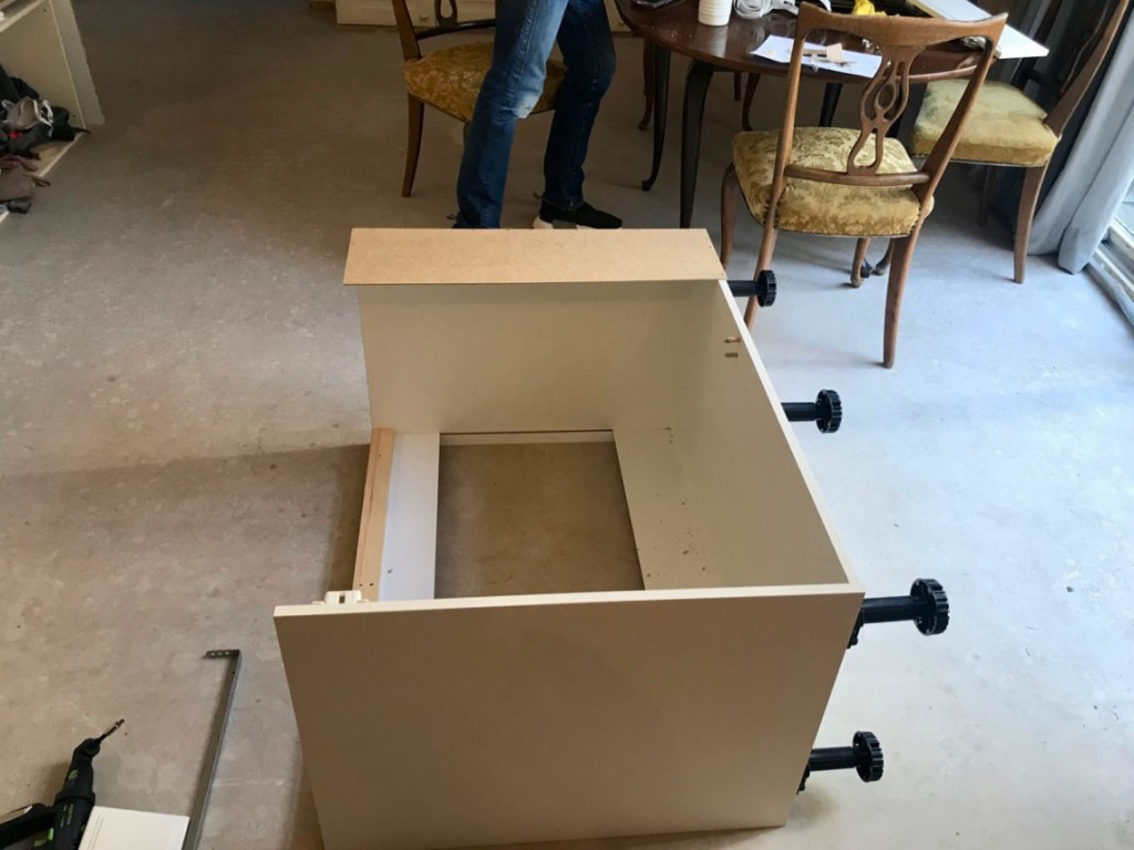 Vervolgens gingen we samen de kasten op de juiste plaats zetten inclusief het marmeren aanrechtblad, inclusief een hangkastje. Ook om te proberen hoe diep het aanrecht wordt. We besloten tot 70 cm. Lekker diep. Kan je twee boterhamborden onder elkaar zetten.
