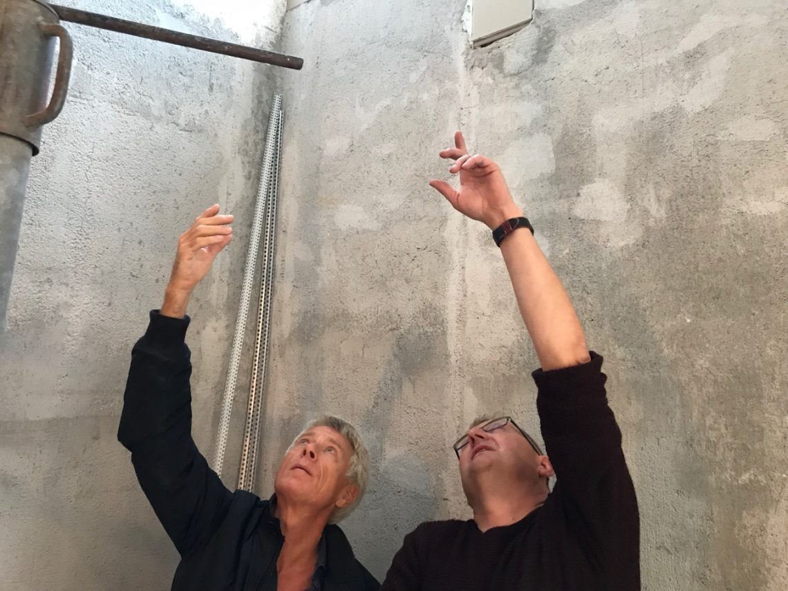 Hessel is nooit te beroerd om even met een hele grote waterpas aan te geven dat de mannen morgen geacht worden om een loodrechte hoek te stucen over de hele lengte.