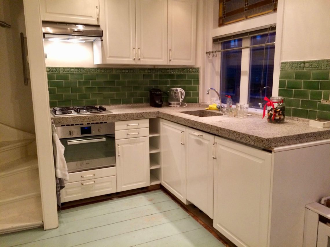 Na de waskamer heb ik de keuken bijgewerkt. Er stonden twee losse blokken keukenkastjes, die heb ik aan elkaar verbonden met 4 plankjes. Daar kan de huurder dan een wijnflessenrekje van maken, of er losse handdoeken in leggen, of wat hij zelf maar leuk vindt.