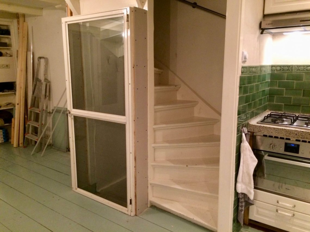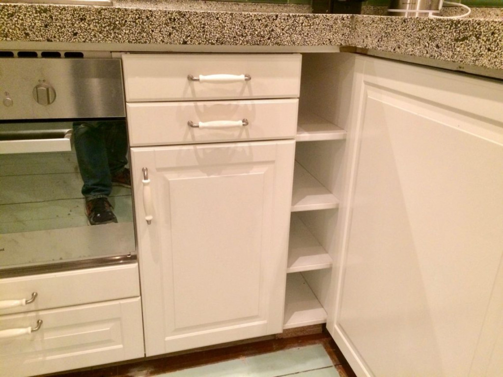 Na de waskamer heb ik de keuken bijgewerkt. Er stonden twee losse blokken keukenkastjes, die heb ik aan elkaar verbonden met 4 plankjes. Daar kan de huurder dan een wijnflessenrekje van maken, of er losse handdoeken in leggen, of wat hij zelf maar leuk vindt.
