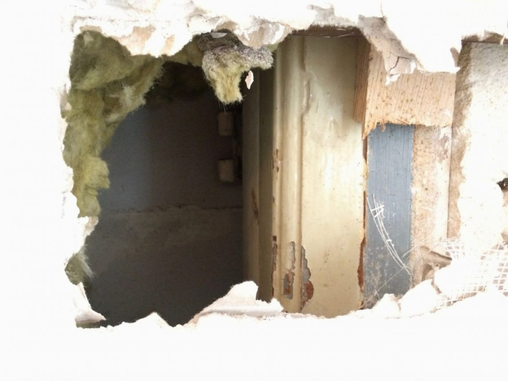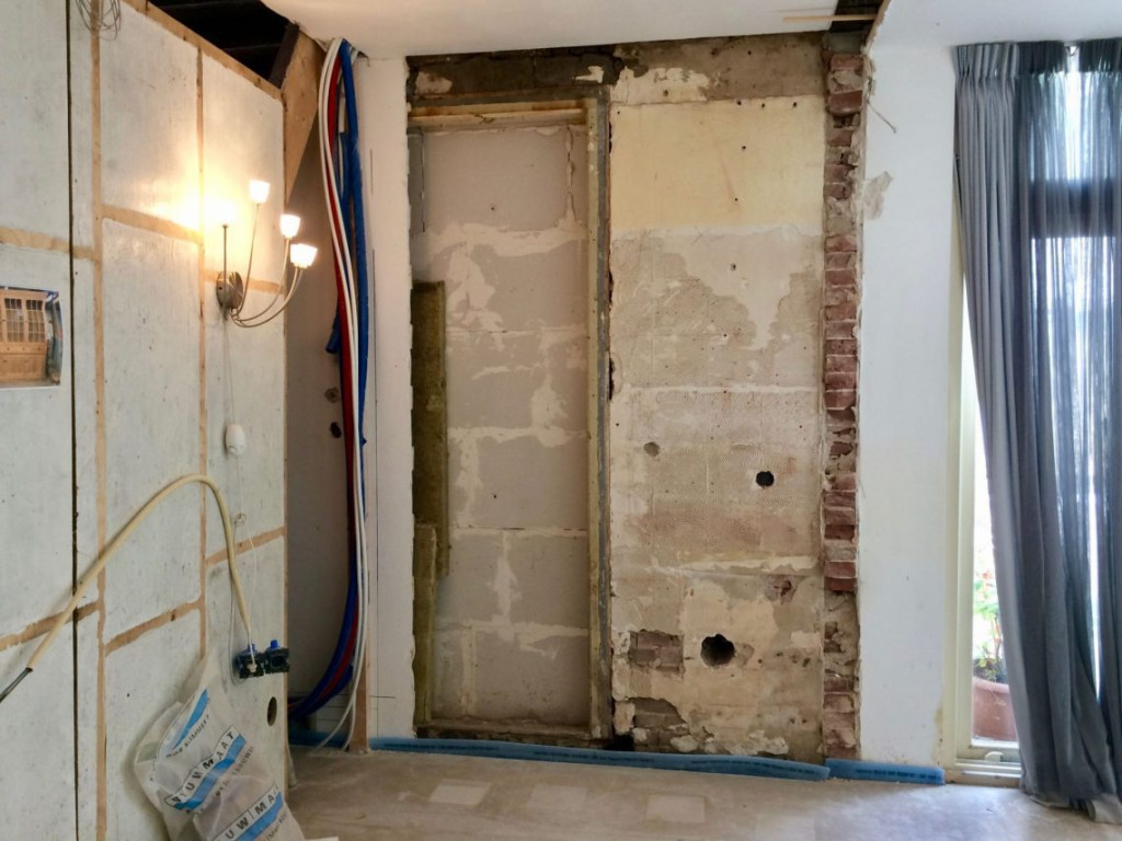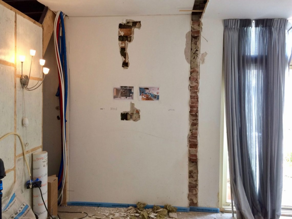 Komende zaterdag gaan we de laatste handtekeningen zetten voor de overdracht van onze wasmachinekamer. Het lijkt er op dat we daar op 31 december gebruik van kunnen gaan maken. En ja, hoe gaat dat, zo’n nieuw bezit, dat gaat kriebelen. Ik werd nieuwsgierig. Op de plaats waar straks de tussendeur gaat komen, daar had vroeger, volgens oude bouwtekeningen, een dubbele deur gezeten. Nu was daar niks meer van te zien, want tegen die wand was een gipsplaten voorzetwandje geplaatst. Zou ik eens een gaatje maken? Niks definitiefs, maar gewoon een kijkgaatje om te zien wat er achter het gips zou zitten?