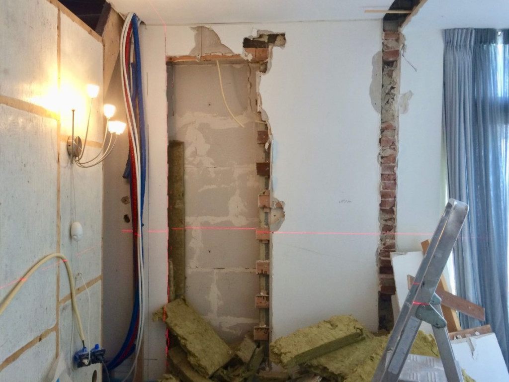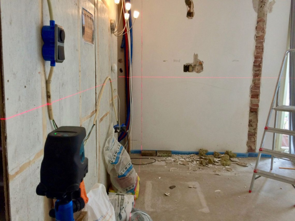 Ik kreeg de smaak te pakken. Ik kon natuurlijk net zo goed het voorzetwandje voor de deuropening weghalen. Als ik nou voor de toekomstige deur aan de linkerkant een kolom van twee bakstenen breed zou overlaten, dan kon ik daar met gemak een latei (een versteviging die je boven een opening plaatst. Tegenwoordig vaak van gewapend beton) op laten rusten. Met de laser heb ik een keurige verticale lijn op de muur uitgezet.