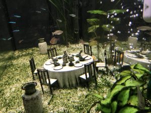 En ik vond het zelf nogal prettig dat het dus heel erg ‘done’ blijkt te zijn om je boeken op kleur te sorteren! Ook schattig was een klein aquarium met daarin vissen en een gedekte eettafel. Om de hoek zie je nog een kleine oranje vis, die even tevoren nog op de tafel lag.