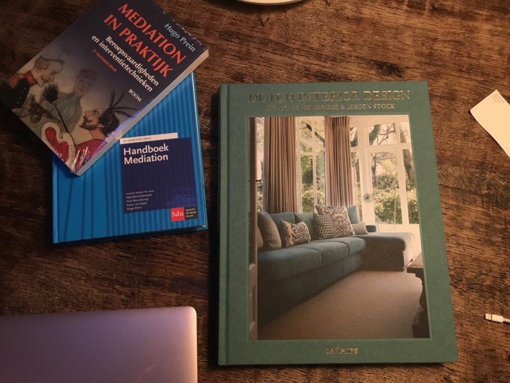 Thuisgekomen was het nieuwe boek van Stock Interieurs aangekomen. En wat ziet u daarbij liggen…twee boeken over mediation. Dat is dan weer mijn nieuwe voornemen. Ik ga in 2018 een opleiding voor mediaton volgen heb ik bedacht. Het is interessant, komt altijd van pas en ik hou altijd erg van studeren en nieuwe dingen leren. En mogelijk blijkt tzt dat ik er beroepsmatig echt iets mee kan gaan doen. Zover is het nog niet. Ik heb alvast de verplichte literatuur aangeschaft om te onderzoeken of het echt een goed idee is.