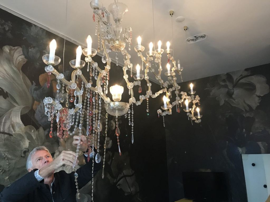 In de bibliotheek van het gebouw zag Hessel meteen dat de kroonluchter niet goed hing, maar dat heeft hij even hersteld (ook zo apart want volgens mij zou niemand anders dat ooit hebben gezien!)Â Tot zover Hessels voorgaande renovaties. Het was echt leuk het nu een keer in het echt te zien.