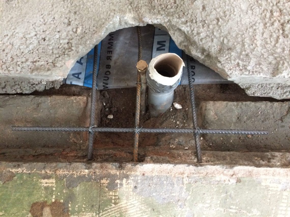 Nu alleen nog even de pijpjes wegwerken, dacht ik. De trouwe lezers van ons blog weten hier inmiddels alles van: midden uit de vloer steken twee koperen waterleidingen en een PVC afvoerpijp omhoog. Niemand weet waar ze vandaan komen, niemand weet wat ze er doen. Er staat waterdruk op de pijpjes, en wij willen ze kwijt. Eerst maar eens de hoofdwaterleiding afgesloten, en dan lekker de elektrische zaag er in. Het eerste leidinkje ging voorbeeldig tegen de vlakte. Mooi diep weggezaagd, een dop er op, en klaar is Kees. Toen de tweede leiding. Ik was ook weer lekker aan het zagen, toen ik hem plotseling zag bewegen. Ik voelde er even aan, en hield hem los in mijn hand. Afgebroken. Rondom de leiding had ik slechts een paar millimeter zicht op het koper, hij zat echt tot zijn oksels in het beton. Daar past geen dop meer op.