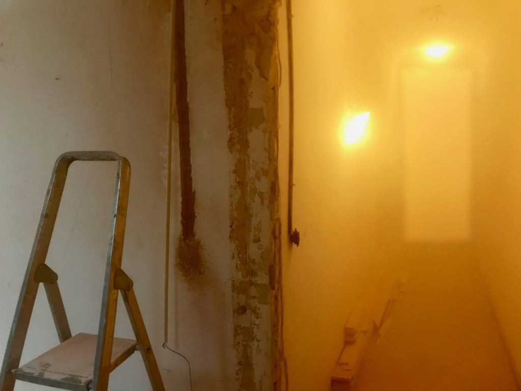 Ziet u de vaag verlichte rechthoek rechts op de foto? Dat is de huiskamer aan het eind van de gang toen ik klaar was. Het stof zat werkelijk overal. En dat was nog maar de eerste sleuf. Uiteindelijk was de sleuf drie PVC pijpen dik, en zag ik geen hand meer voor ogen.