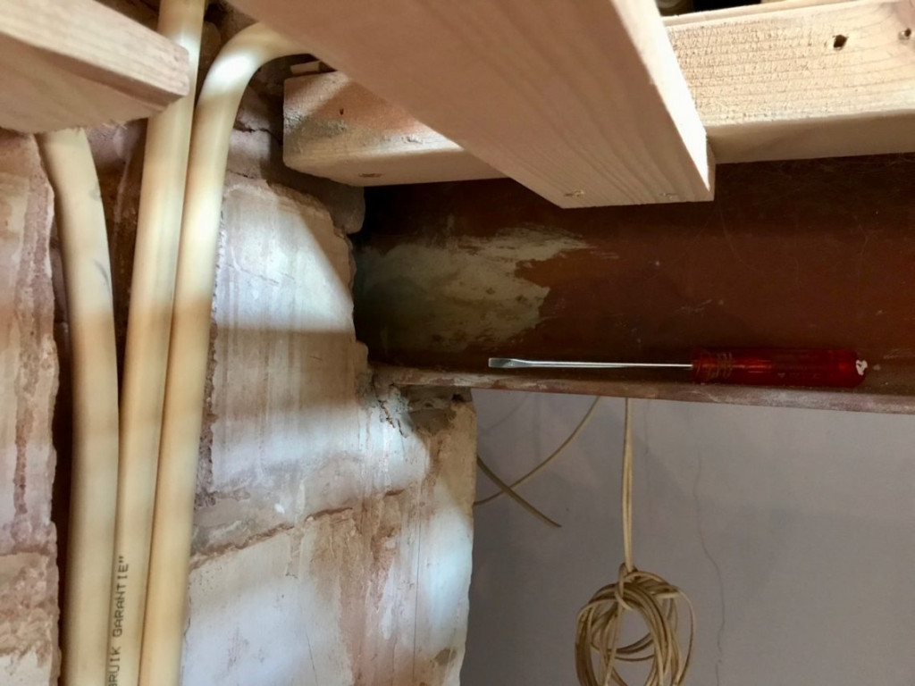 Toen de rust was weergekeerd, heb ik de leidingen in de gleuf gebogen. Op het trappetje deed ik zelfs nog een leuke vondst. De schroevendraaier die ik al maanden kwijt was, lag gewoon rustig op me te wachten in de stalen steunbalk boven de deur.