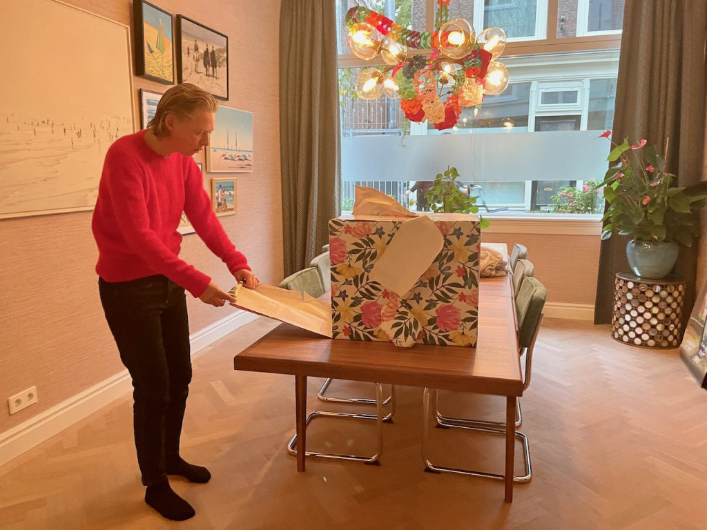 Hoe groot was mijn verbazing toen er toch een gigantisch pak op de tafel stond toen ik beneden kwam. Ik was zelfs zo verbaasd dat ik er uit zag als ‘Hessels broertje die niet helemaal goed is’. Niet dat hij die in het echt heeft hoor! Hessel heeft me de hele week lopen dollen met deze foto en ik ben niet te beroerd om ‘m hier te plaatsen.