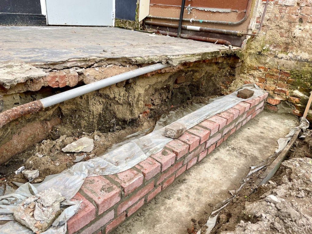 Hessel was overdag bezig met het metselen van de funderingsmuur. Dit kon slechts voor de helft, omdat aan de ene kant nog de ijzeren rioolpijp lag te wachten totdat dokter Bart ‘m zou komen verwijderen. De muur is opgemetseld van speciale harde stenen, die overal tegen kunnen. Het is opzettelijk nu nog slechts drie rijen hoog. Het ziet er, zoals we van Hessel kennen, perfect uit. Als het metselwerk droog is wordt er aarde tegenaan gestort, en daarna metselt Hessel gewoon weer verder.