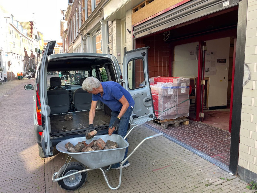 Het nieuwe bestelautootje werd deze week ook echt ingezet voor het doel: twee ladingen puin en oude stenen konden zo het autootje in en weg.