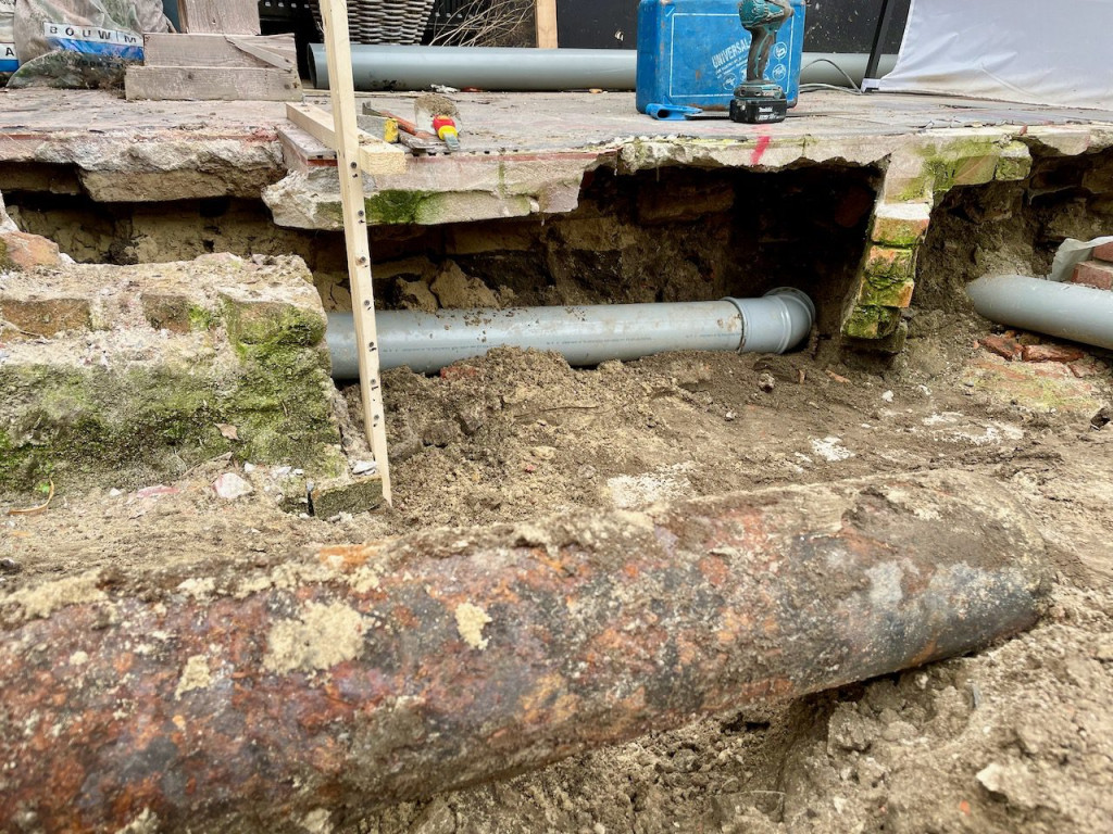 Op de voorgrond de oude pijp, er achter de nieuwe pijp met een nieuwe bocht.