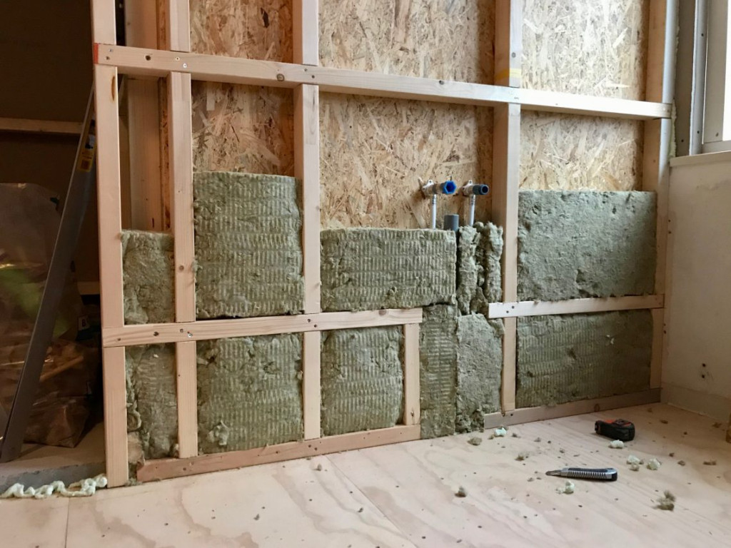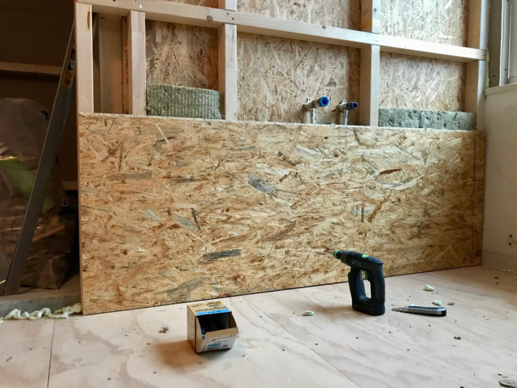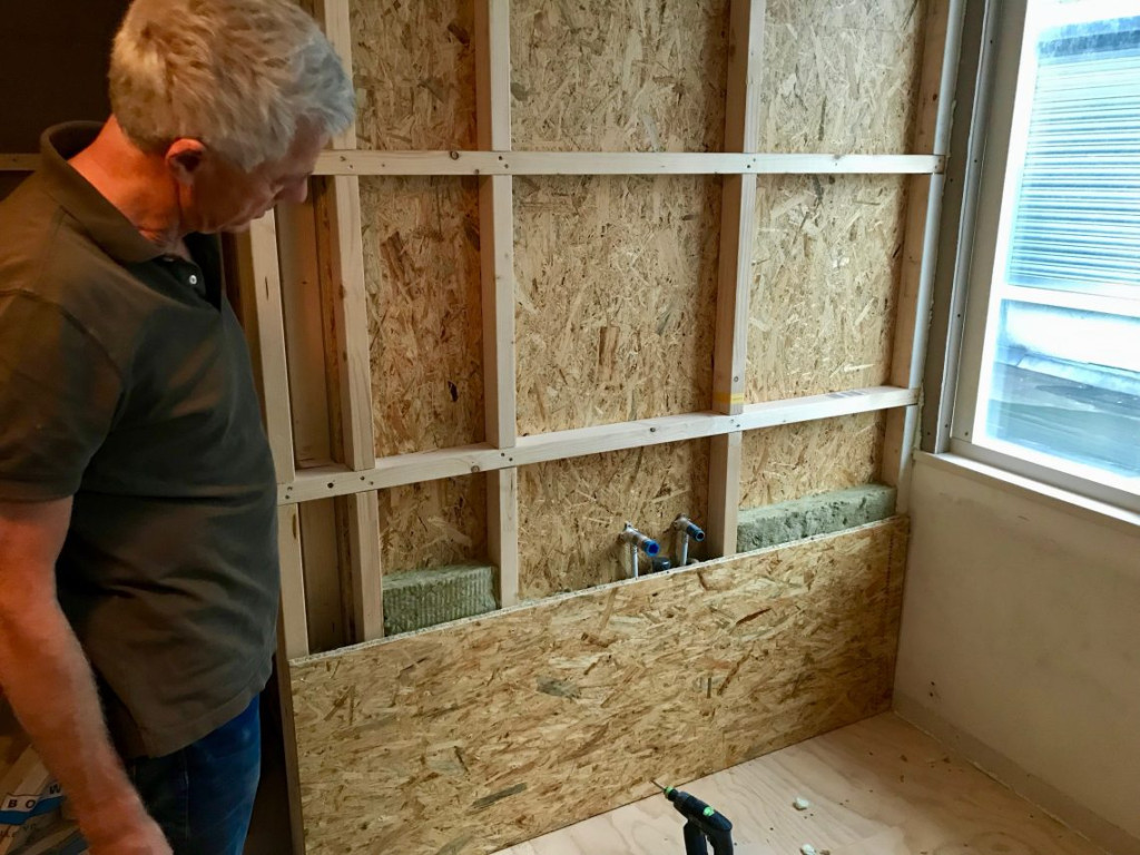 En onder de aankomende wastafel was alvast een stukje “muur” geplaatst. Zodat de vloer daar volgende week tegen aan kan.