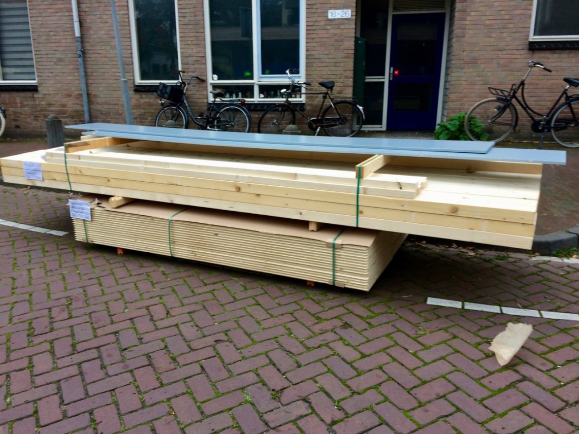 Mariusz himself was er vandaag, ik had beloofd om als vijfde wiel aan zijn wagen te zullen fungeren, dus het zweet liep me al om 9:15 over de rug. Best wel leuk, om je eigen dak door steegjes heen te sjouwen, en om de Polen een half uurtje later de eerste balken in onze eigen tuin op maat te zien zagen.