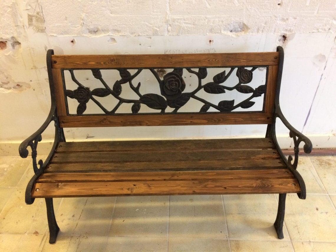 Toen het bankje helemaal schoon was, heb ik de verrotte houten delen vervangen door wat restjes sloophout die ik van het verbouwen overgehouden had.