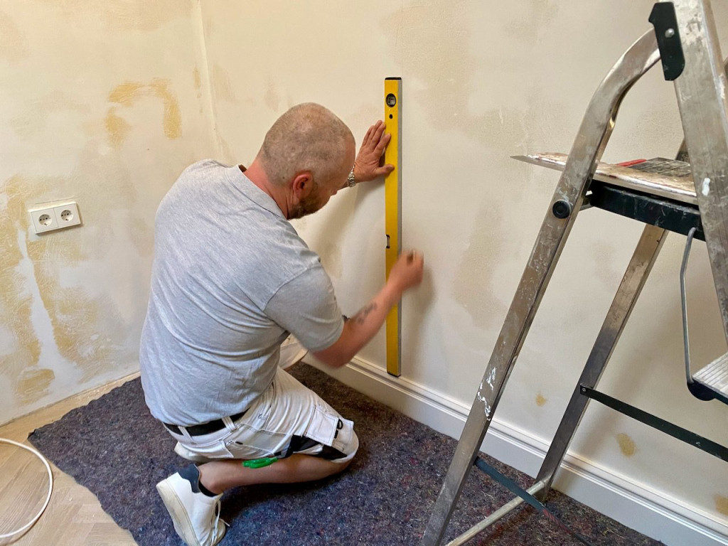 Na een tijdje was het zover. Chris lijmde de eerste baan Iksel op de lange muur.