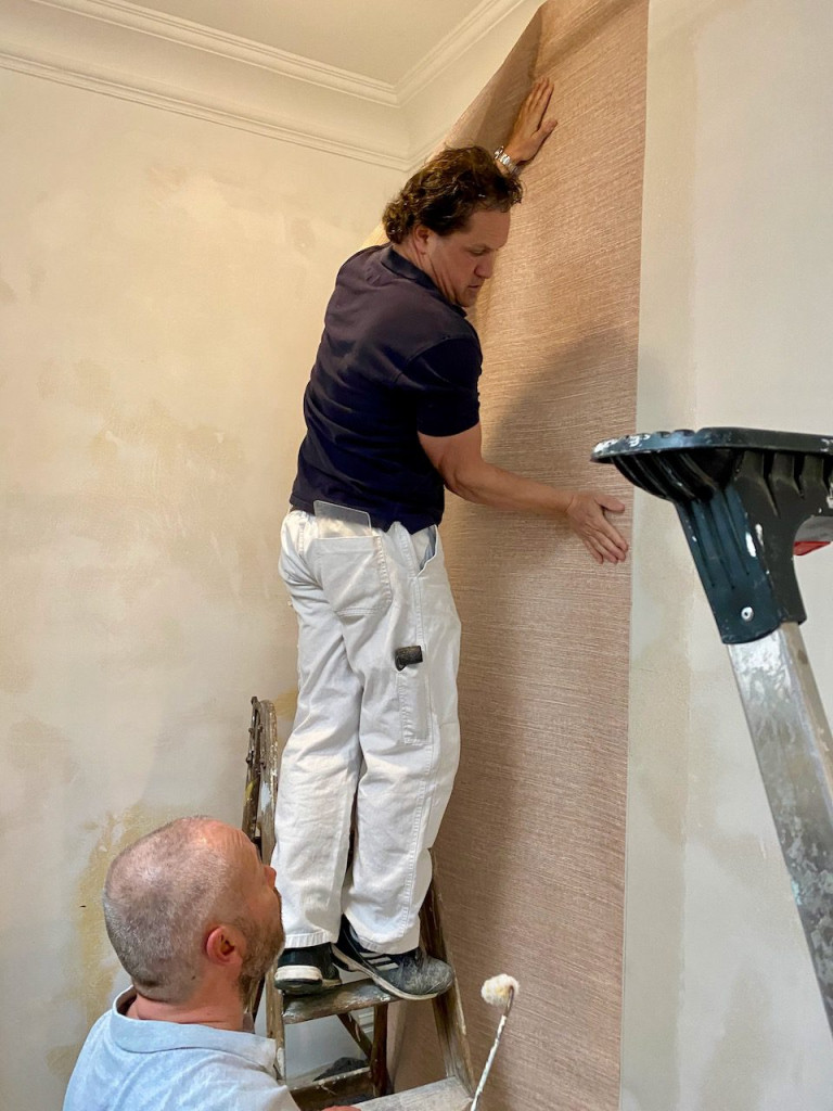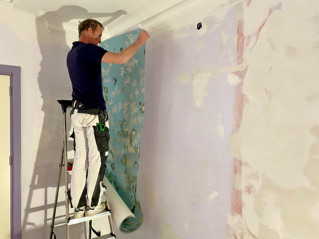 Twee mannen begonnen met het roze behang ter hoogte van de open haard.
