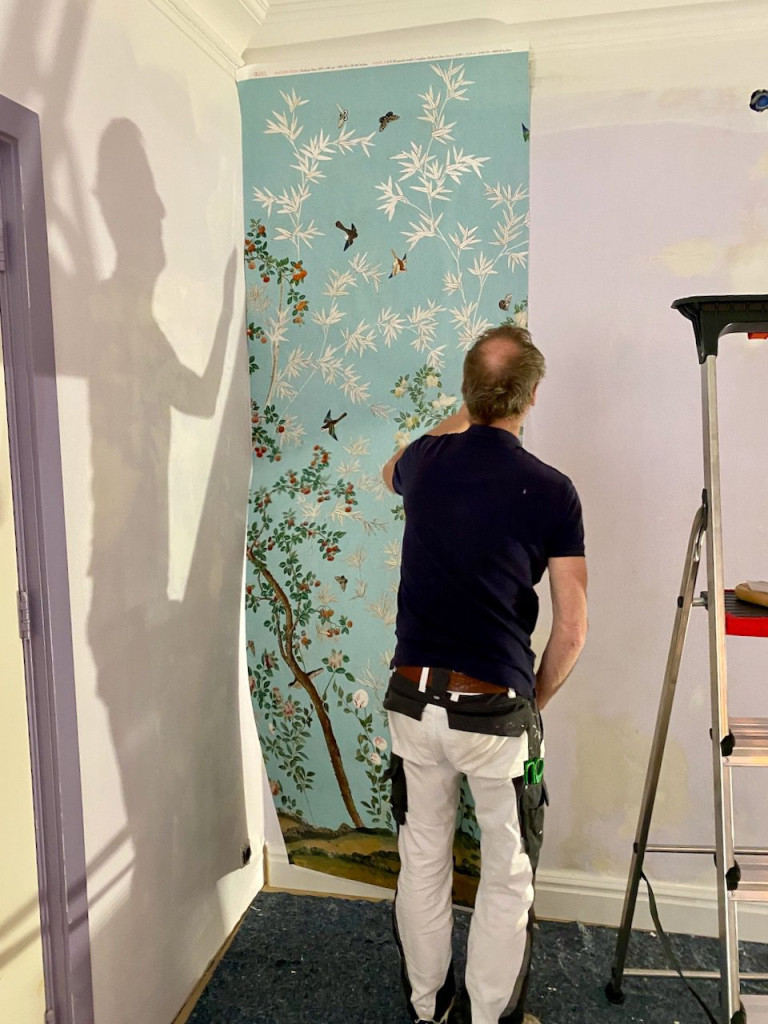 Tegen de tijd dat Chris de tweede pilaar gepasseerd was, wist ik weer precies waarom Annie en ik zonder een moment van twijfel “JA” hadden gezegd, toen Jeroen Stock dit behang had voorgesteld. Het is echt het allermooiste behang wat ons huis verdiend heeft. De woonkamer knapte er per nieuwe baan meer van op.