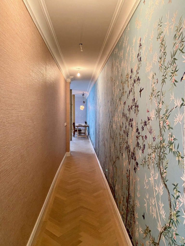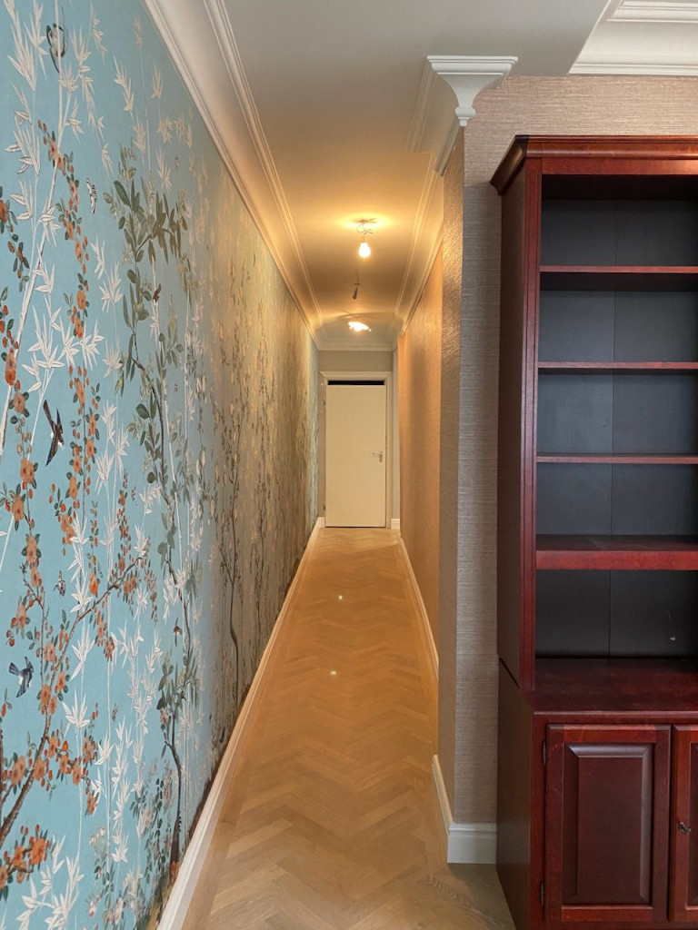 Toen de mannen weer naar huis gingen, waren de hele voorkamer en gang behangen. Ik heb een tijdje door het huis op en neer gelopen. Alles wat de afgelopen 4 jaar vertrouwd was geworden, voelde plotseling heel anders. De boekenkasten, het behang, er was zoveel visuele informatie bijgekomen dat ik het echt moest laten indalen. De conclusie: het voelt nog niet als mijn eigen huis, maar wel als een huis waar ik me heel erg op mijn gemak ga voelen.