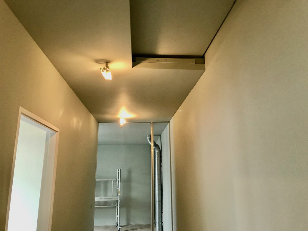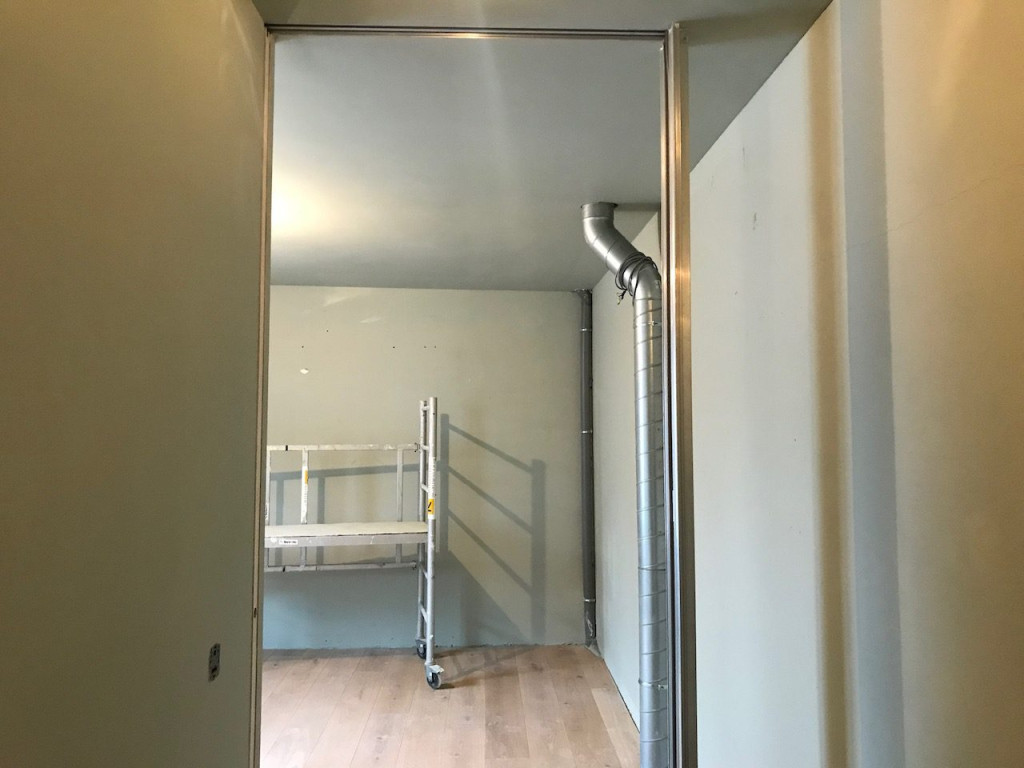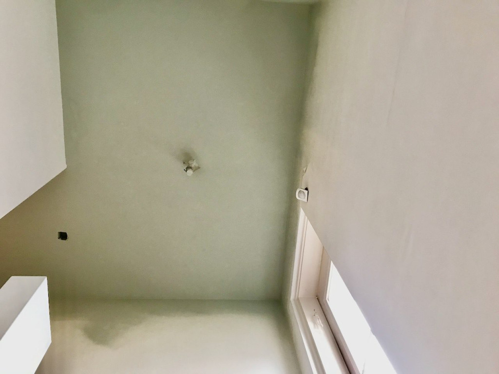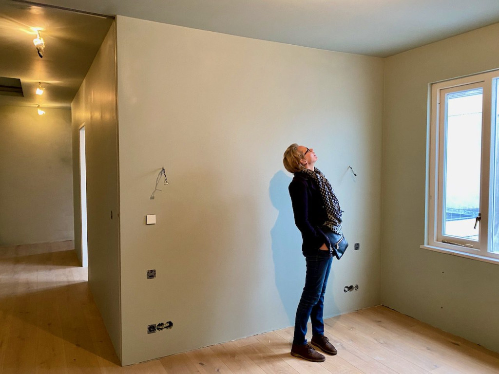 Deze ochtend gingen de Polen nog een keer met de echte groene kleur spuiten boven, en wij gingen rond 1500 even naar Haarlem om te kijken. Het zou de eerste keer in mijn leven zijn dat ik een groen plafond zou zien, dus ik vond het best spannend. Bij binnenkomst zagen we dat de Polen alweer vertrokken waren. Alles was supernetjes opgeruimd. We bekeken eerst de kiezelkleurige keukenmuur. Dat was echt top. Het past ook te gek bij de vloer.