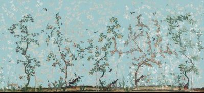 Volgens Stock komt op de lange muur een -kneiterduur- behang met bomen en bloemen. Helemaal tot in de gang.