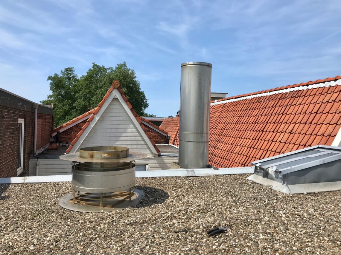 Gelukkig was er geen wind. Ik ben eindeloos aan het meten en passen geweest, zonder te kunnen ontdekken wat nou de binnen en wat de buitenflens zou zijn. Een paar uur later heb ik grof geweld gebruikt. Ik heb met een flinke tang de ene rand naar binnen gebogen en de andere rand naar buiten, en toen, eindelijk, schoof de kap op de schoorsteen.