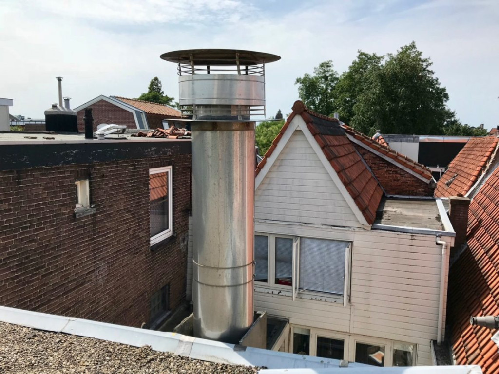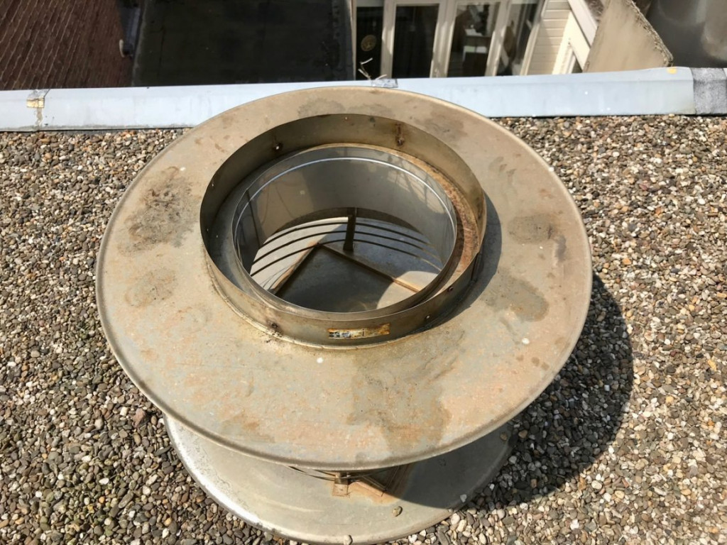 Gelukkig was er geen wind. Ik ben eindeloos aan het meten en passen geweest, zonder te kunnen ontdekken wat nou de binnen en wat de buitenflens zou zijn. Een paar uur later heb ik grof geweld gebruikt. Ik heb met een flinke tang de ene rand naar binnen gebogen en de andere rand naar buiten, en toen, eindelijk, schoof de kap op de schoorsteen.