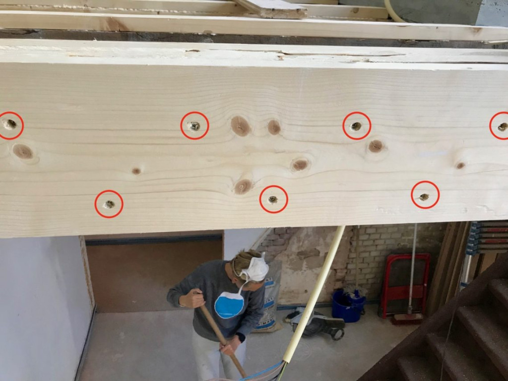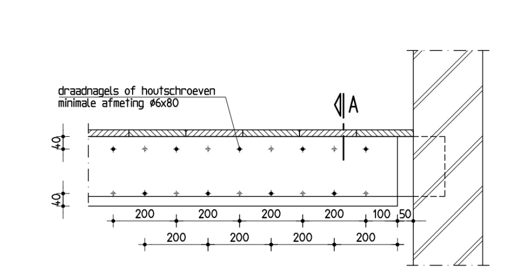 In de balken moeten op exacte afstanden (20 cm van elkaar, 4 cm van onder en 5 cm van boven) schroeven ingedraaid worden. Namelijk zo: