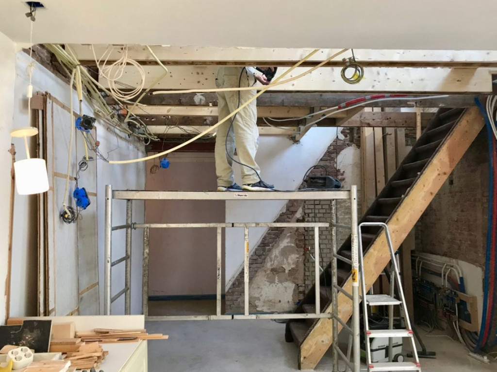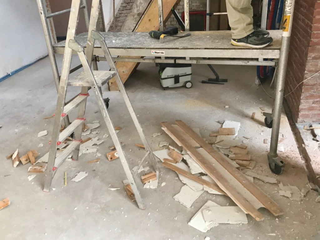 Ik trok mijn bouwpak aan en dingdong de bel: mijn moeder fietste langs en zag het licht branden dus kwam even hallo zeggen onderweg naar het station. Hessel stond in de keuken al op de steiger van Jan om de laatste resten plafond weg te halen.