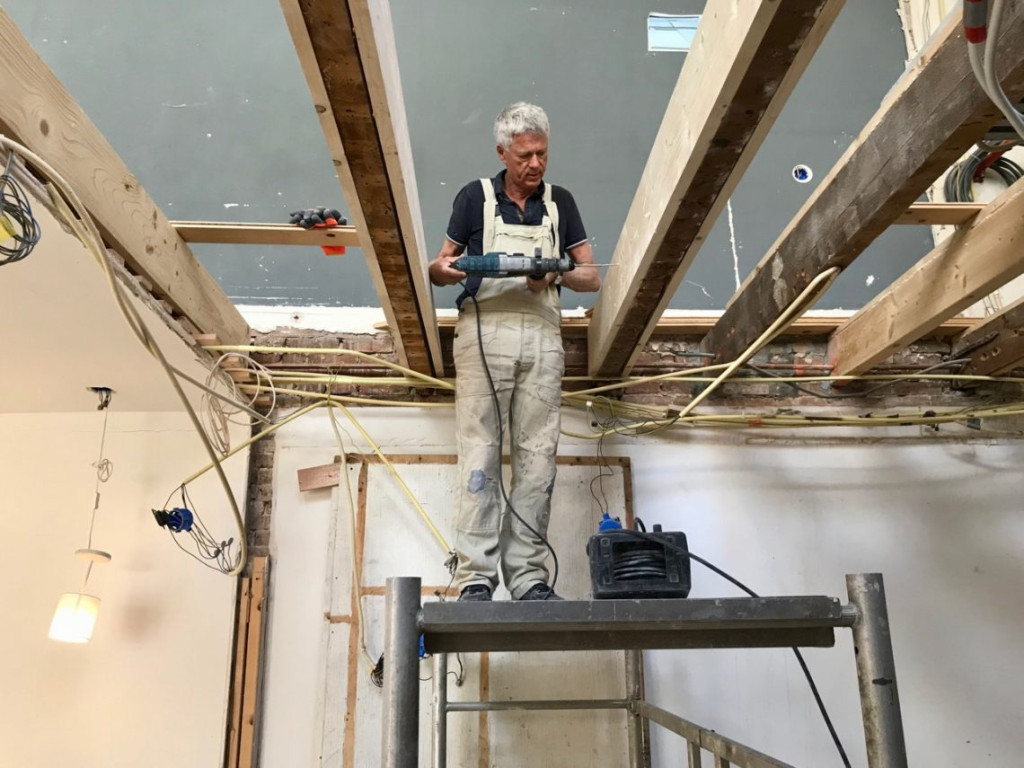 Dan kan Hessel dat tzt weer gebruiken om het nieuwe plafond op gelijke hoogte vast te zetten. Hij was ondertussen met wat hij zelf noemde “meditatieve werkzaamheden” bezig.