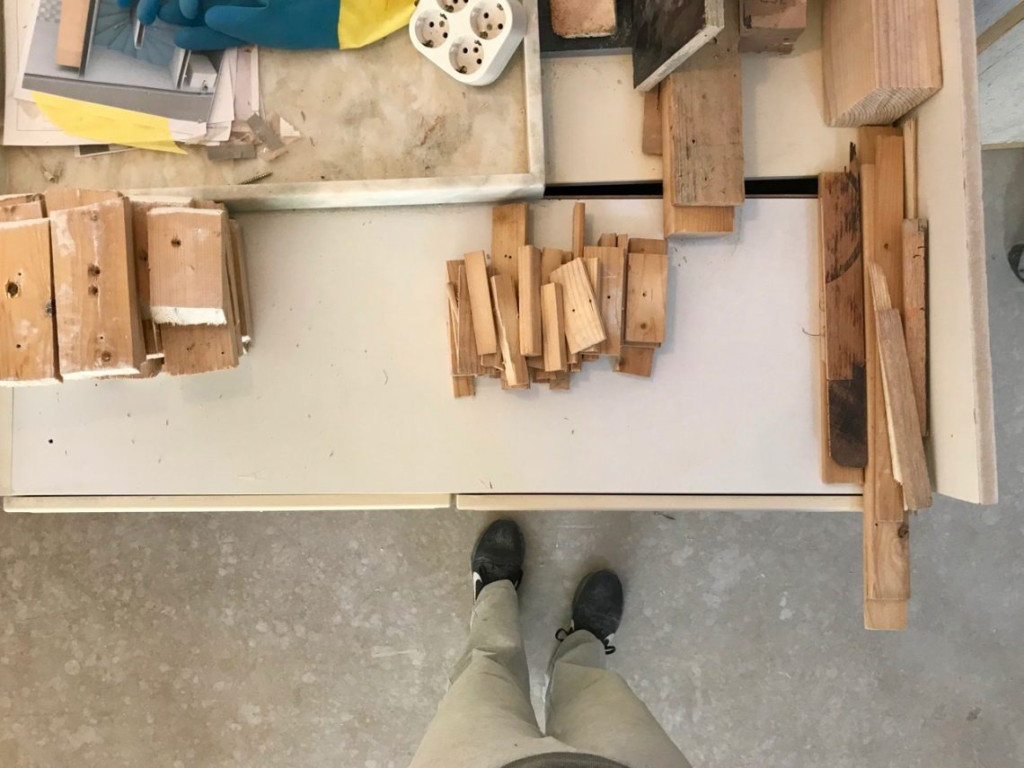 Ik sorteerde de houtjes uit het oude plafond en haalde de schroeven er uit.