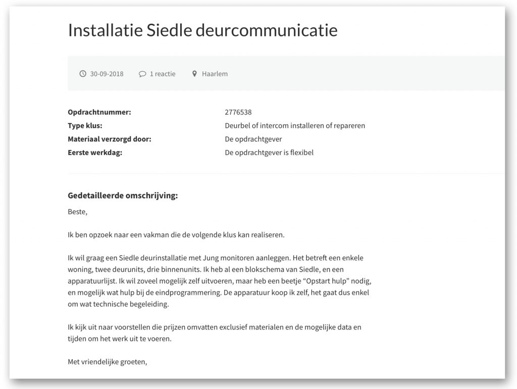 Ik ben de weken daarna wat aan het rondneuzen geweest op het internet, en kwam wat hoopvolle alternatieven tegen. Maar ik wist nog steeds niet goed hoe ik mijn ideeën in praktijk moest brengen. De paar installateurs die ik indertijd in Haarlem over Siedle gesproken had, vielen als onbetrouwbaar af. En verder kende ik niemand in die branche. Ik besloot een laatste poging te wagen om het Siedle avontuur op gang te krijgen. Er was toch een site die “Werkspot” heette?