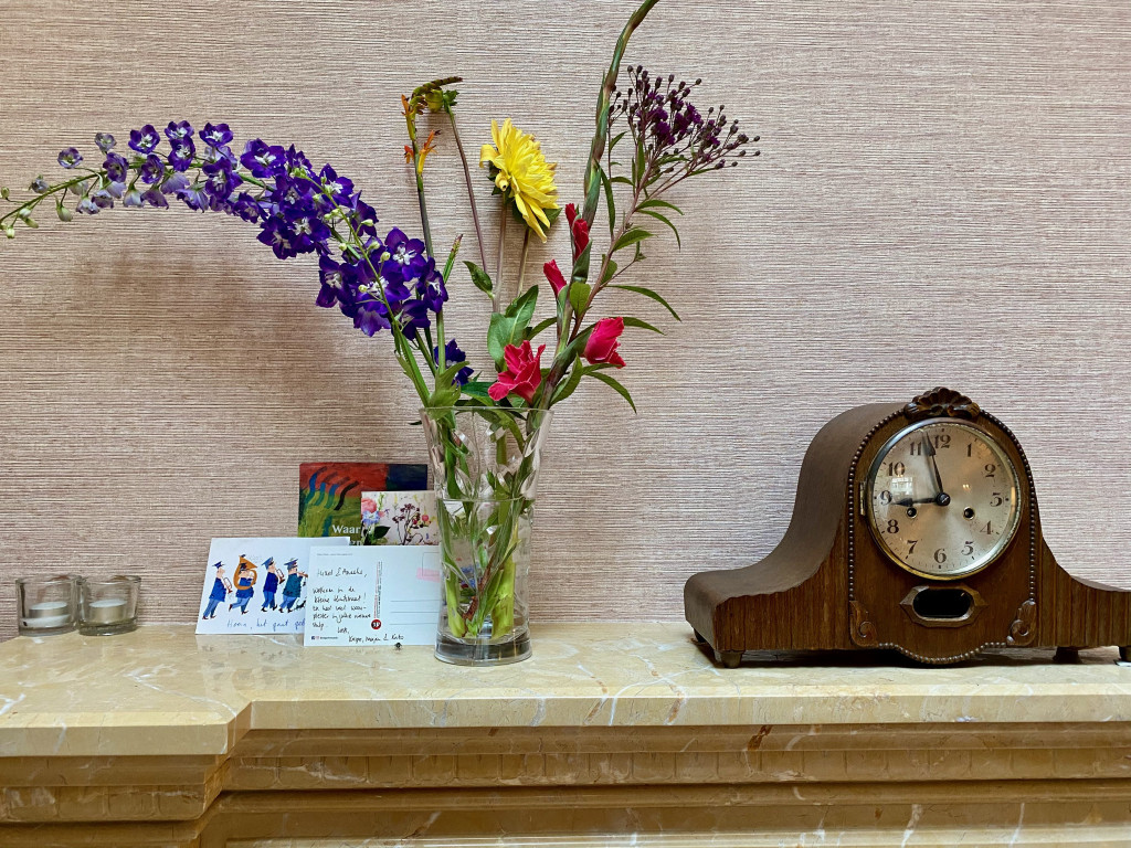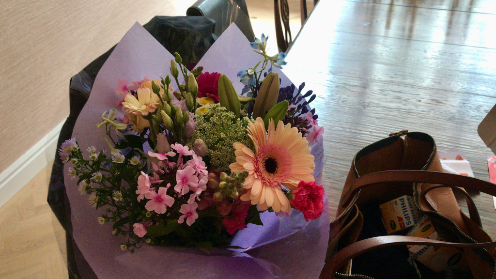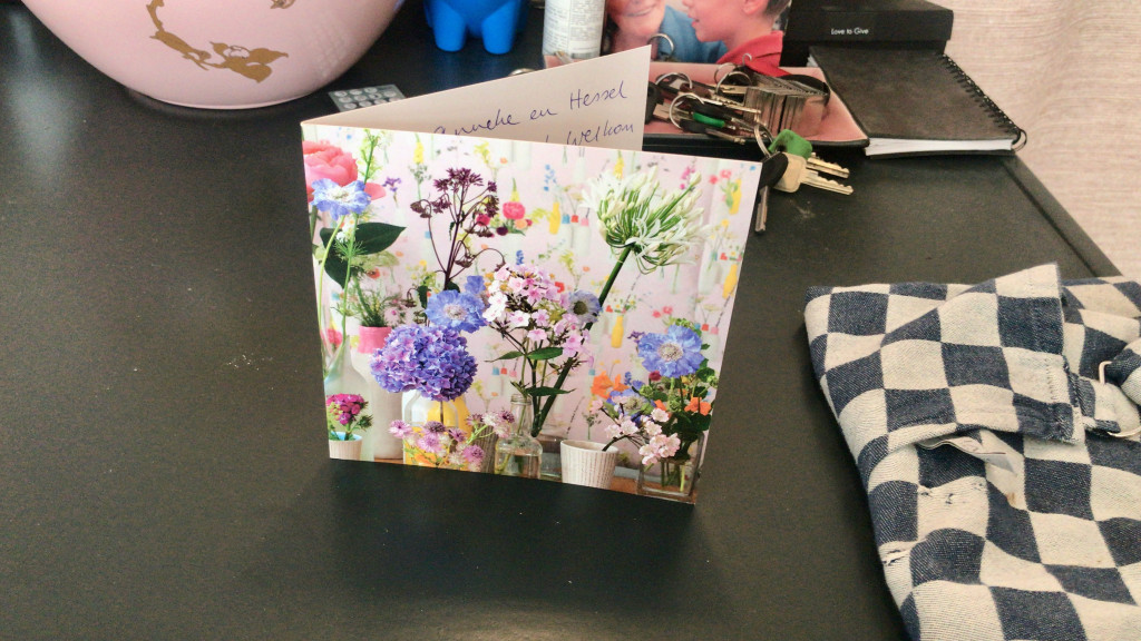 Er werden bloemen van Karen bezorgd, een kaart van de ouders van Marieke, en van Gert en Marieke zelf. En de buren kwamen binnen om een fles wijn af te geven. Heel erg leuk allemaal! Alsof we jarig waren.