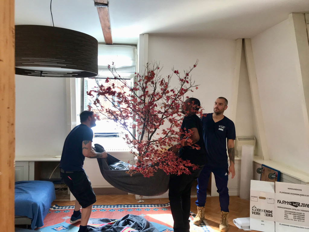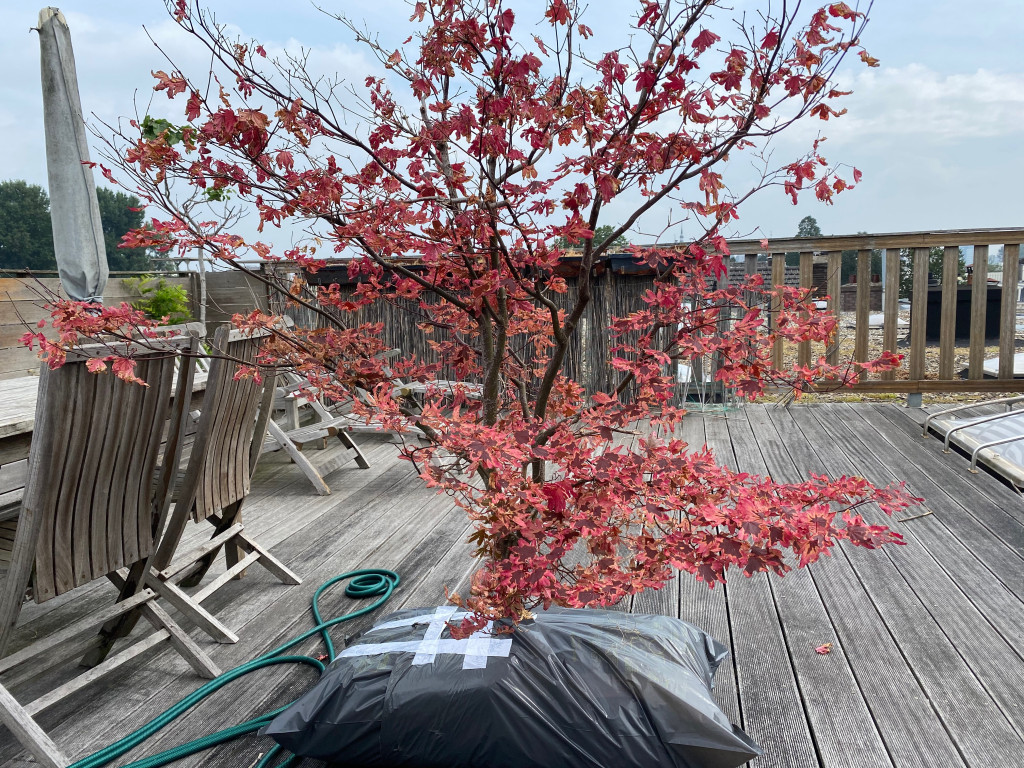 Hessel had ook een verzoeknummer: zijn Japanse Esdoorn. Of die ook mee kon? Het was zo zielig om ‘m zo alleen op het dak te laten. Hessel had ‘m helemaal uitgegraven en ingepakt.