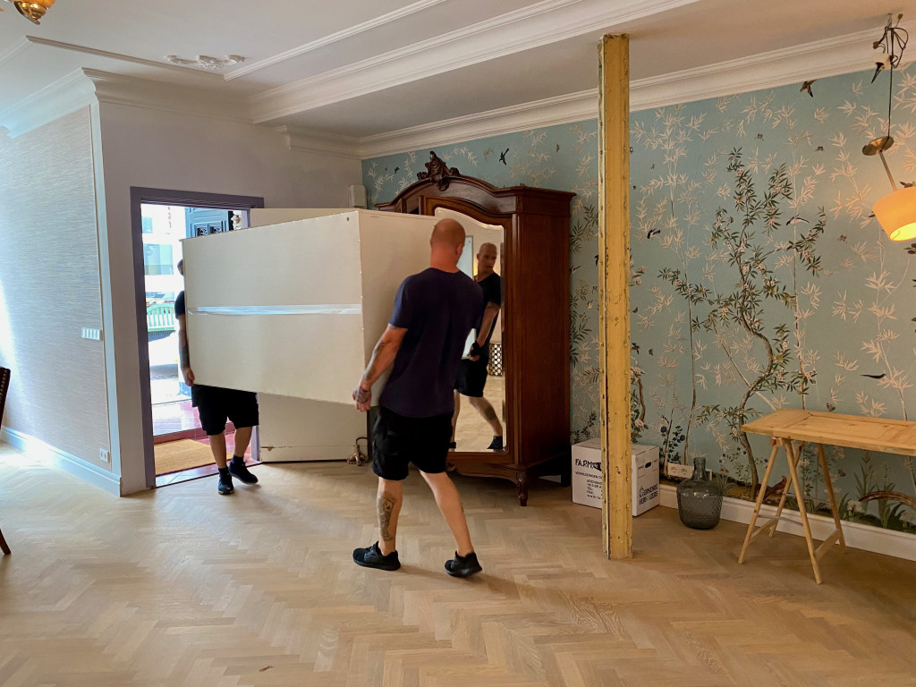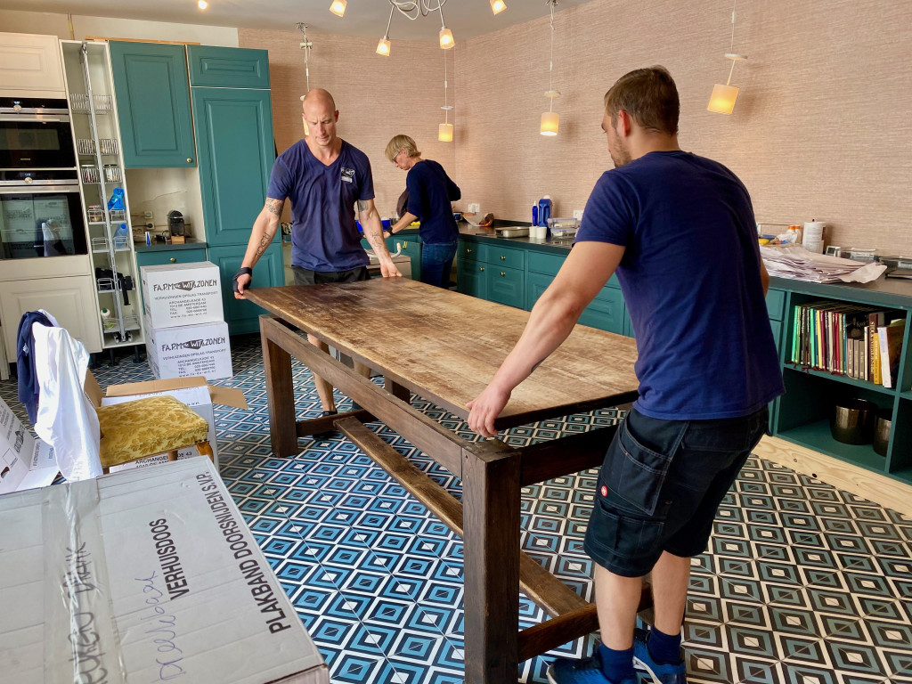 Ondertussen zetten de verhuizers Hessels tafel in de keuken.