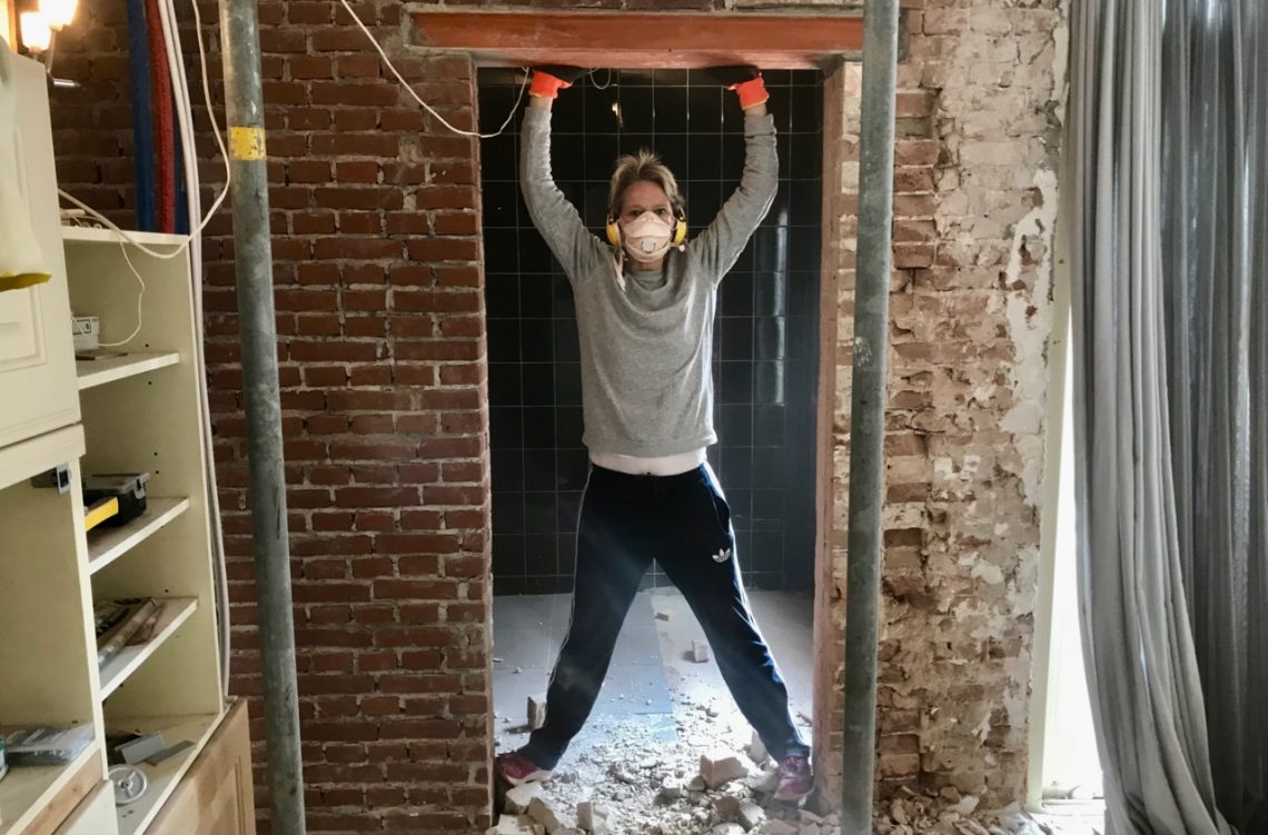 Hessel ziet er hier een beetje uit als een plumpuddinkje, maar dat was een momentopname. De slagboormachine is vrij zwaar. Hessel bikte de stenen los en ik pakte ze aan: de gebroken stenen links…