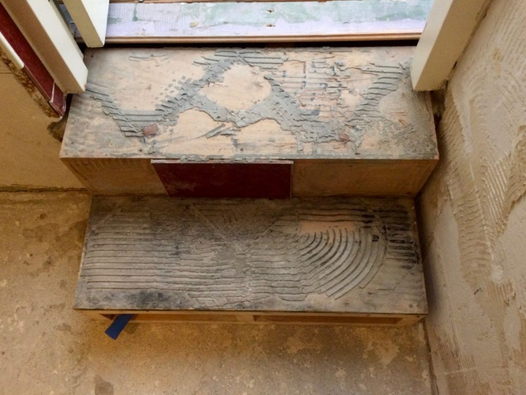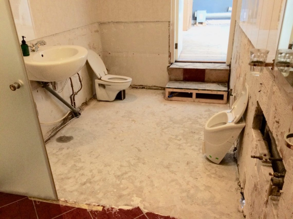 Ik ben nog eens met het sanitair gaan slepen, heb met tape allerlei afstanden op de vloer gemarkeerd, heb van een oude douchedeur even een douchewondje gemaakt, heb in verschillende posities op een denkbeeldige WCpot gezeten, en heb toen geconcludeerd dat er maar één opstelling is die aan al onze eisen voldoet. Om helemaal zeker zeker te zijn, heb ik het trappetje naar de slaapkamer wat ingekort. Vroeger liep je over twee diepe tredes de badkamer binnen, nu kom je de eerste trede meteen na de slaapkamerdeur al tegen.