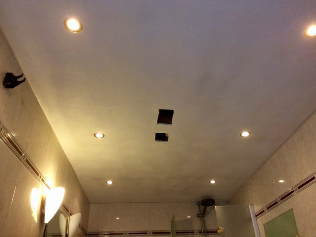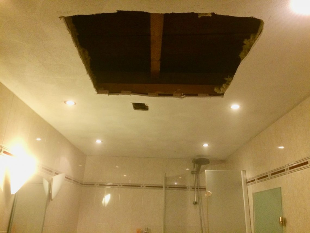 Zo, een hele zorg minder. En zoals dat gaat, rolt na het nemen van een beslissing de verbouwingssneeuwbal uit zichzelf een stukje verder. Nu het duidelijk was waar de wastafel hangt, kon ik ook eens gaan onderzoeken waar ons toekomstige daklicht gaat komen. Als eerste heb ik maar weer eens een paar kleine kijkgaatjes gemaakt.
