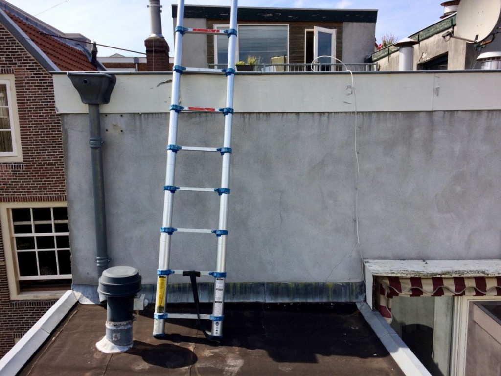 Nu de situatie aan de onderkant bekend was, wilde ook ook wel eens weten hoe het dak er vanboven uit zou zien. Met de uitschuifladder ben ik van dak naar dak geklommen. Het dakje van de badkamer loopt heel schuin af. Ik heb het opgemeten, en het verloop is drie graden. Dat klinkt niet veel, maar kijk eens hoe scheef de ladder staat om dat afschot te kunnen beoordelen.