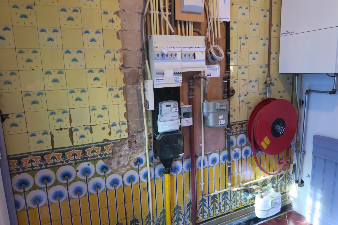 Hij was nog goed leesbaar. Sinds wanneer zou de hele gas en elektra unit tegen de antieke tegels aangeschroefd hebben gezeten?